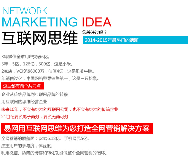 易网全网营销型网站建设将为您提供从PC电脑版网站、手机触屏版网站、APP手机客户端、微信平台开发等四网合一 的网站系统建设,实现同一个后台同步管理、各种终端自适应。
